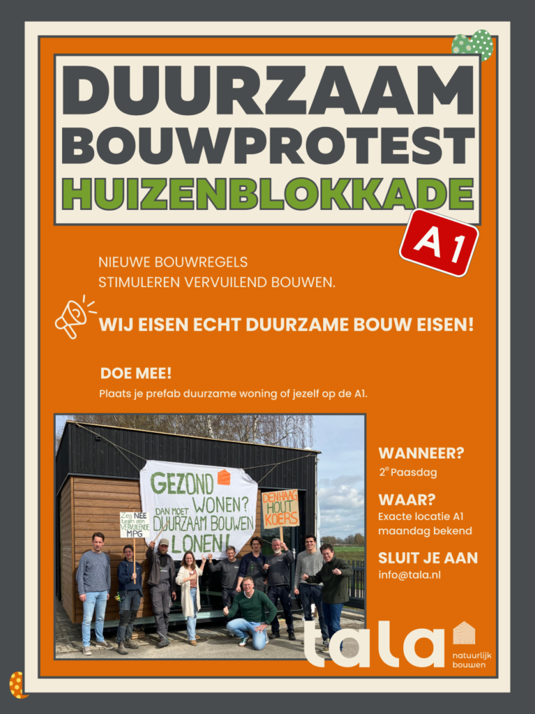 ‘Wij zijn het zat! Wij eisen strenge en eerlijke eisen voor duurzaam bouwen.’ Natuurlijk bouwbedrijf Tala uit Broekland roept op tot duurzaam bouwprotest op de A1, met een huizenblokkade. Aanstaande maandag zal het bedrijf haar prefab biobased woningen op de snelweg plaatsen om zo aandacht te vragen voor dit onderwerp. Ze roept andere bouwbedrijven op hetzelfde te doen en zo een duurzaam verplaatsbaar straatje te vormen. ‘De woningnood én klimaatverandering eisen nu een andere koers!’