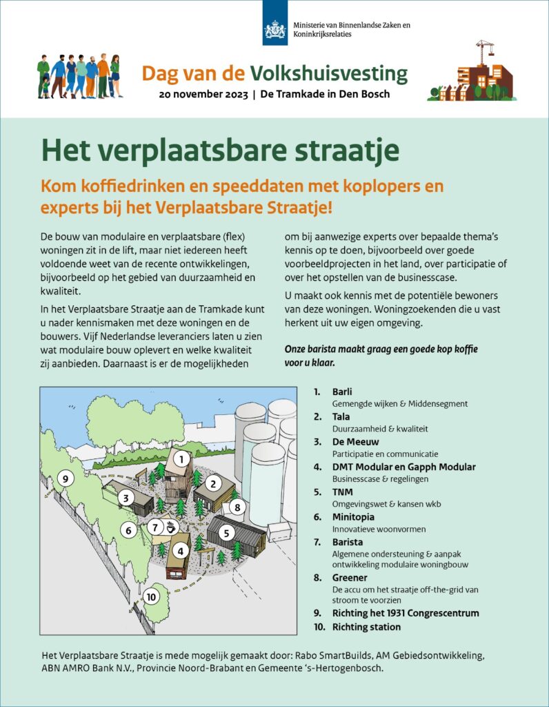 Ook na de Dag van de Volkshuisvesting kun je nog de hele week buurten in het Verplaatsbare Straatje. In samenwerking met het ministerie van Binnenlandse Zaken (Volkshuisvesting), de Brabantse Week van het Wonen (provincie) en allerlei andere partijen is een uitgebreid programma opgezet.