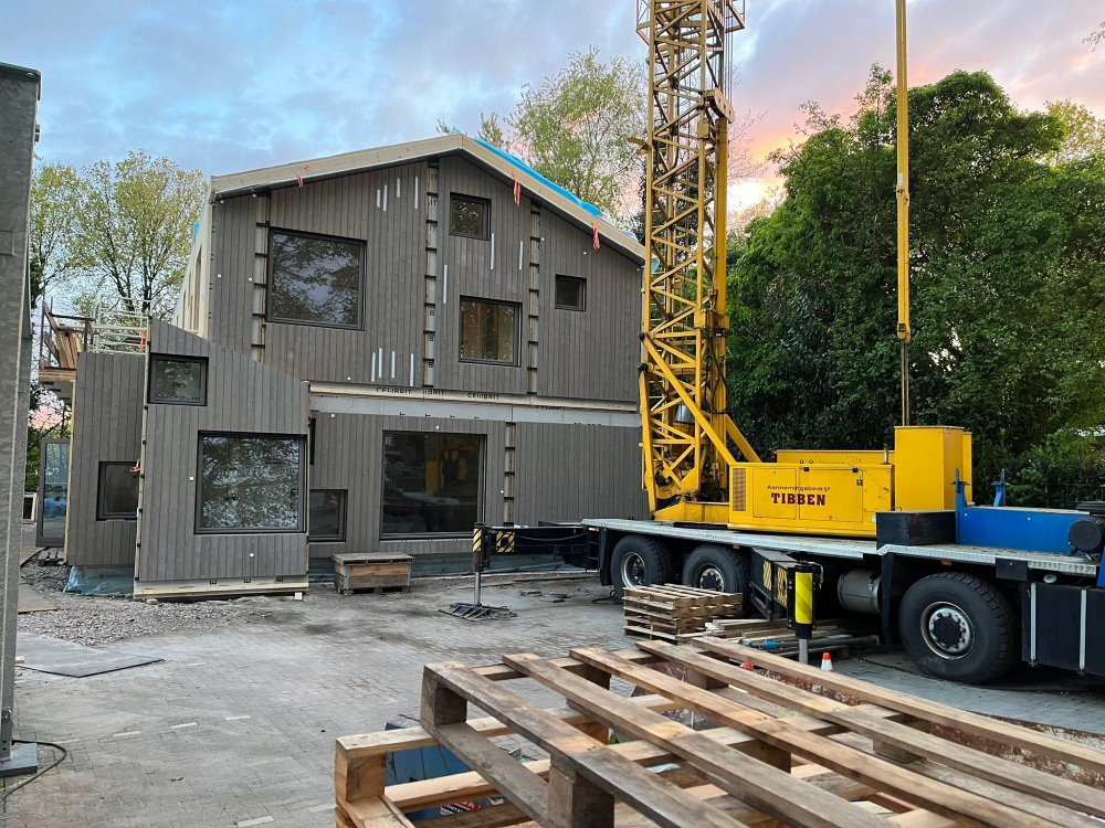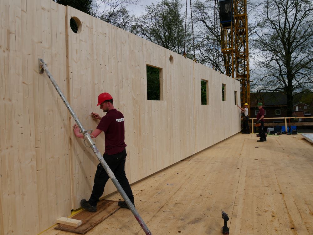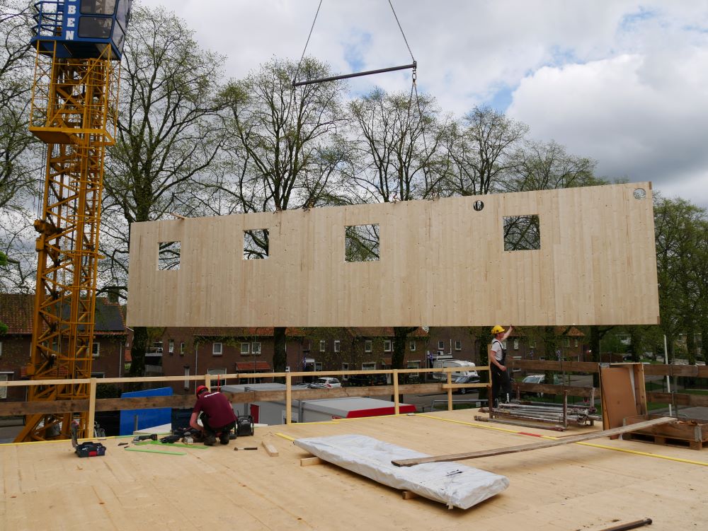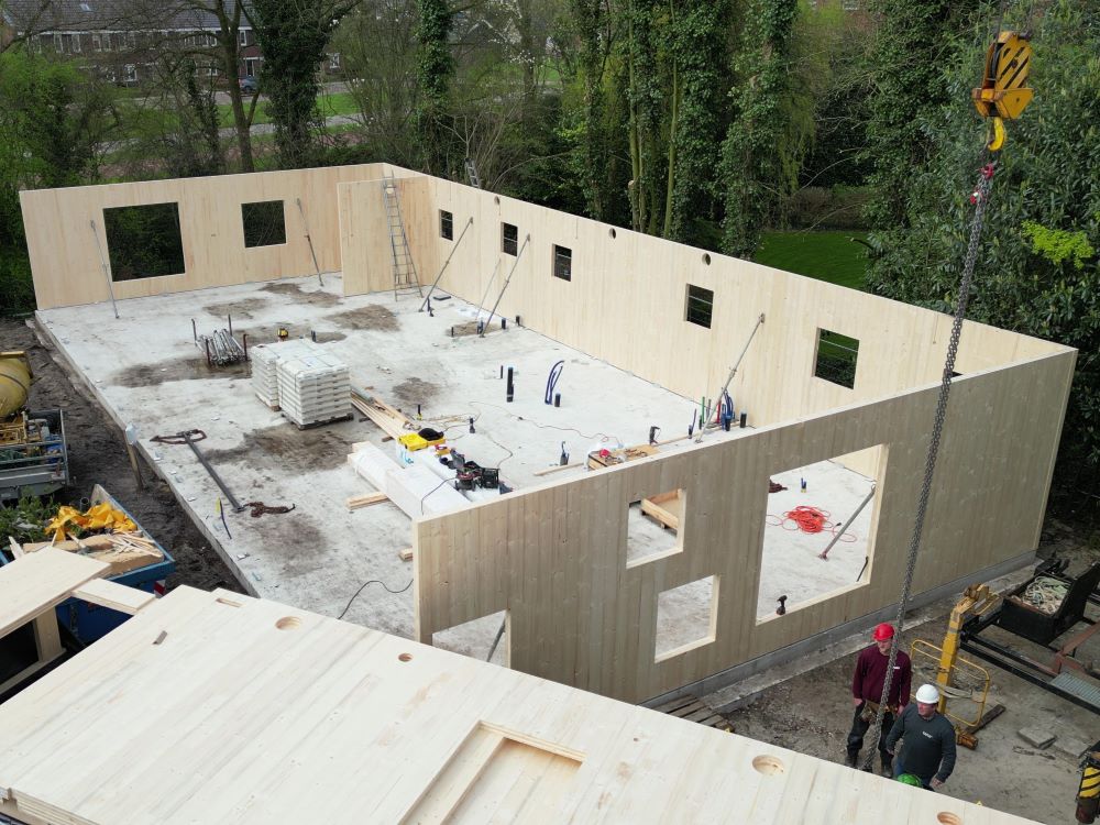 - Het kruislaaghout (CLT) komt op maat uit de fabriek aan en wordt met meters tegelijk als een bouwpakket in elkaar gezet.