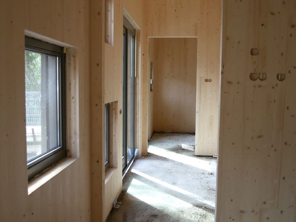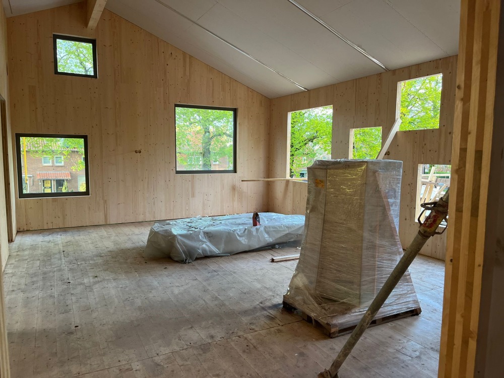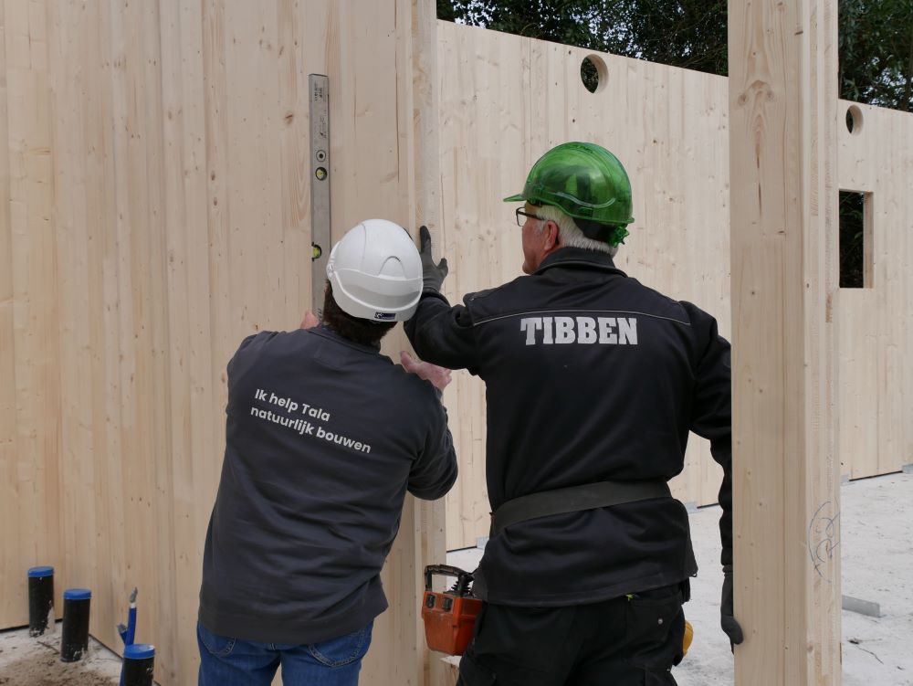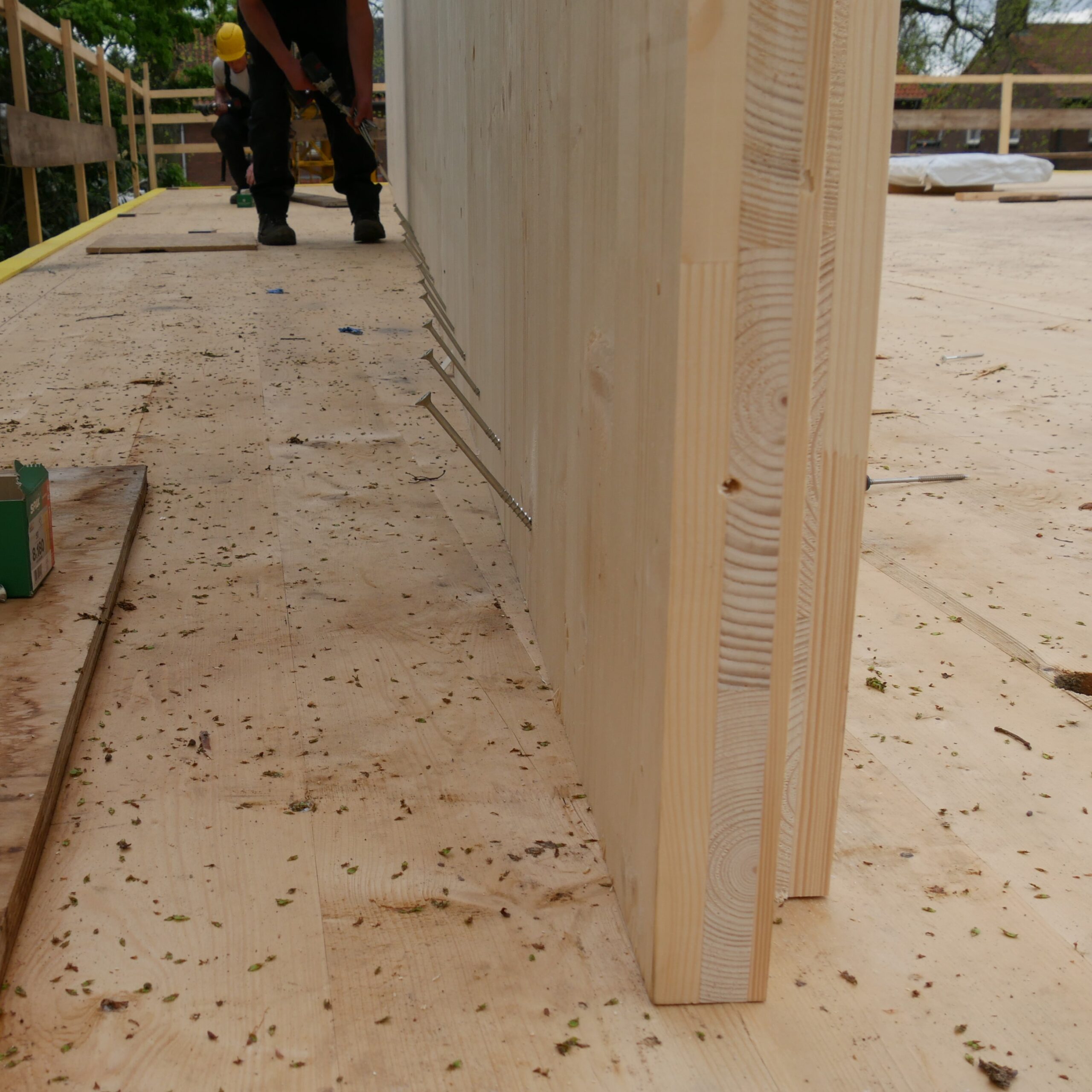 - Het kruislaaghout (CLT) komt op maat uit de fabriek aan en wordt met meters tegelijk als een bouwpakket in elkaar gezet.