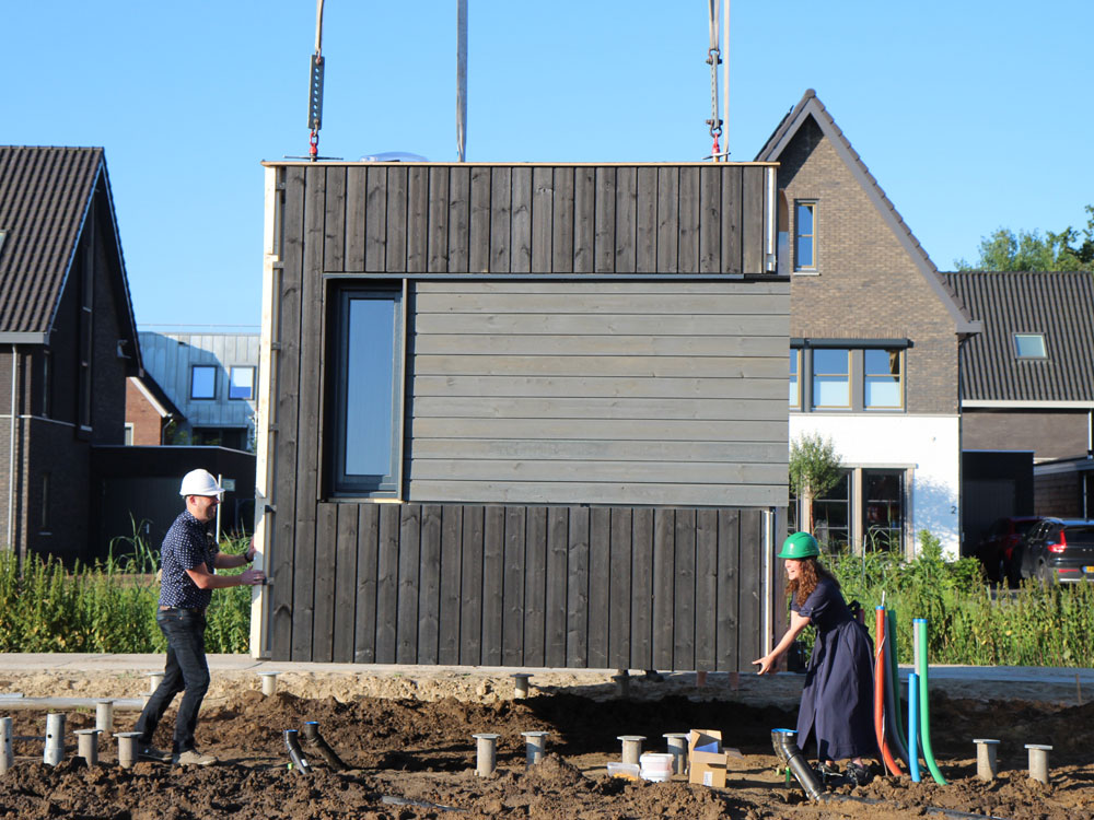 Woudenberg – Met de plaatsing van de eerste modules is de bouw van de 10 biobased rug aan rug woningen in opdracht van Omnia Wonen gestart. Wethouder Anne Kuik en Bob van Leeuwen van Omina Wonen hebben samen met Team Tala de eerste woning nabij de Zegheweg in de gemeente Woudenberg geplaatst.
