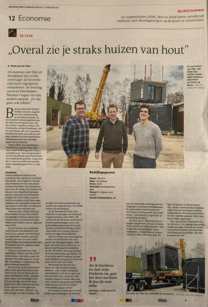 We groeien hard en beleven van alles! Dat valt op. Daarom zie je Tala nu vrij vaak in de media. Soms met een prijs, dan weer een project of een verbazingwekkende ontwikkeling. Hoe dan ook. Wij hebben er veel plezier in steeds weer te vertellen wat wij waarom doen. Zo hopen we van duurzaam bouwen de standaard te maken.